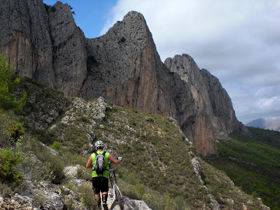 La pista va convertint-se en senda i passem per les restes del mas del Sanxet (4 pedres queden) fins que arribem al Salt. La vista es espectacular i el camí es de nou algun antic camí de comunicació, que baixa fent un parell de S fins que s'arrima a les impresionants parets que tanquen aquesta zona d'Aitana. Proteccions de nou, i ala, cap a baix. La senda es quasi tota ciclable de moment encara que en alguns punts baixem de la bici per "cagalera" més que res. La vista es realment impresionant com pot apreciar-se una mica a les fotos.