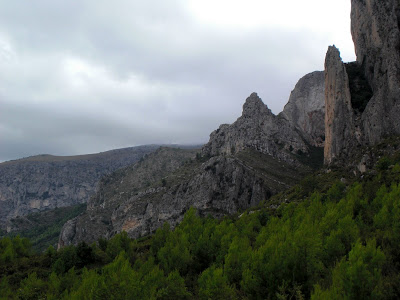 Poc a poc anem guanyant alçada i pareix que el sol s'asoma tímidament a través dels nuvols, que també van mostrant-nos a trams les majestuoses parets de pedra que tenim davant nostre. Mirant el GPS podem adivinar que un dels turons de roca que tenim davant es el castell de Confrides, i el coll per on tenim que passar. Pensem que ens tocará espentar però no, la petita pista puja fent esses fins el coll i sols tenim que espentar uns pocs metres per arribar al coll. Fotos del lloc on alguna vegada deuria haver un castell, perque la veritat es que pareix impossible que en aquelles roques verticals hi hagues alguna cosa.