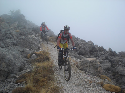 La boira no ens deixa veure el paisatge llunyá, però el forat de Forata apareixent entre la boira es un espectacle que també val la pena. Després de la xarradeta amb Alfonso i la dona que han passat la nit per ahi, després de descansar una mica, no molt per la frescoreta que fa a 1400 mts d'alçada, ens proteccionem i cap a baix, anem cap a Partagàs. Aquest tram el coneixem be, encara que no per això deixa de ser divertit i parem a fer algunes fotos, sobre tot a la zona de "la lluna". Per cert, varem trobar a dos ciclistes pujant per ací, i després som nosaltres els bojos.