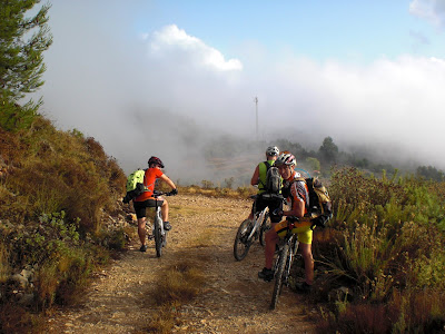 Encara ens queda el pitjor, així que sense parar, continuem pujant cap al cim del Penyó Mulero, per una trencadisima i empinadisima pista, practicament imposible per ciclar (inclús per Alfonso, encara que aquest s'ho cicla quasi tot!). Per fi arribem dalt del Penyó Mulero, de nou paradeta per proteccionar-se i reagrupar-se. En aquest punt la vista encara no es maça bona per la boira i perquè es un cim molt romo, però en quant comencem a baixar cap al Corral del Port i la boira es queda una mica per dalt, les vistes cap al barranc de l'Arc i cap al Vall de Guadalest son espectaculars. I el que ens queda per baixar, que pareix una eternitat veient el fons de la Vall allà baix.